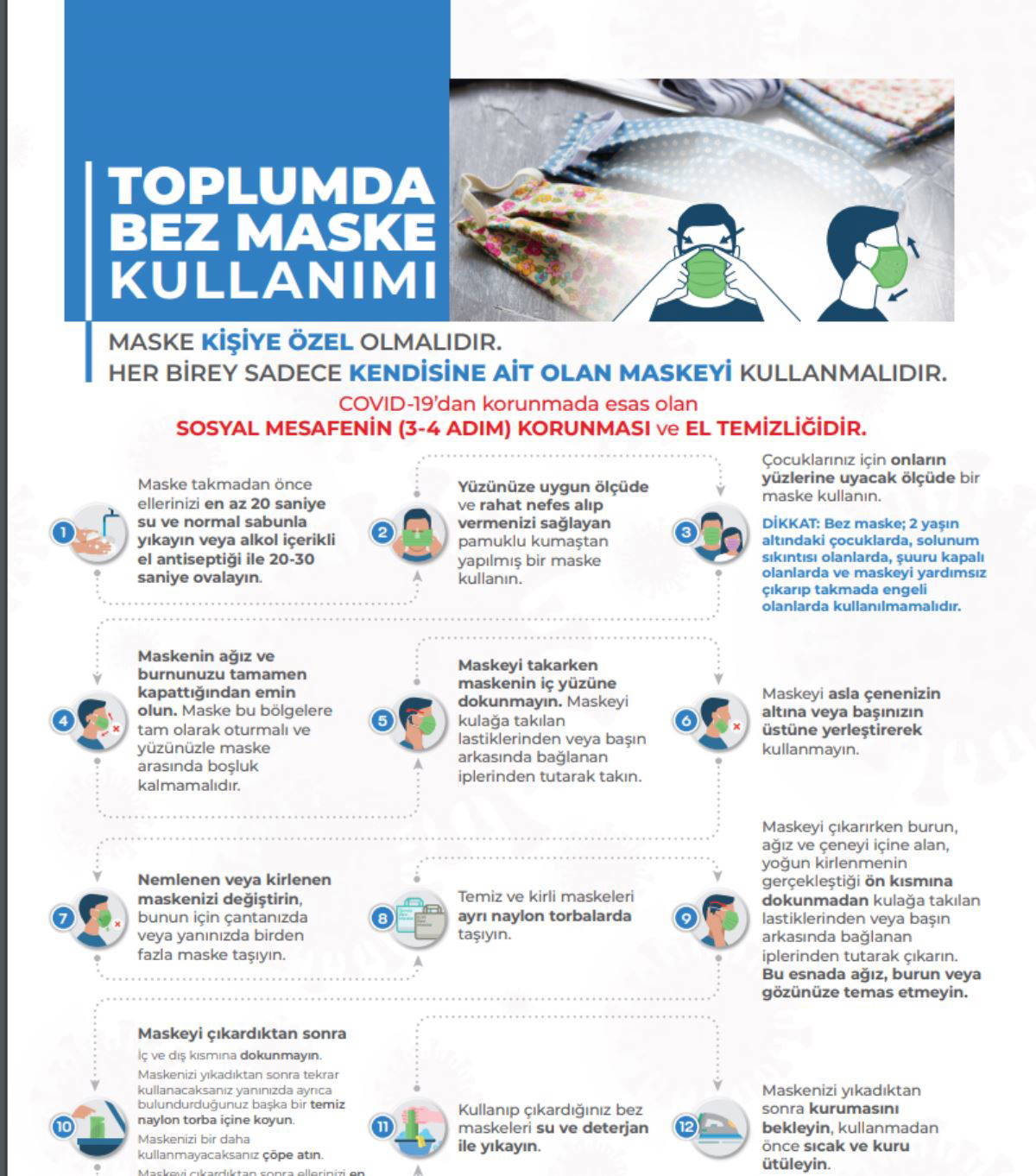 Temiz ve kirli maskelerin ayrı naylon torbalarda taşınması gerektiği belirtilerek, "Maskeyi çıkarırken burun, ağız ve çeneyi içine alan, yoğun kirlenmenin gerçekleştiği ön kısmına dokunmadan kulağa takılan lastiklerinden veya başın arkasında bağlanan iplerinden tutarak çıkarın. Bu esnada ağız, burun veya gözünüze temas etmeyin. Maskeyi çıkardıktan sonra iç ve dış kısmına dokunmayın. Maskenizi yıkadıktan sonra tekrar kullanacaksanız yanınızda ayrıca bulundurduğunuz başka bir temiz naylon torba içine koyun. Maskenizi bir daha kullanmayacaksanız çöpe atın. Maskeyi çıkardıktan sonra ellerinizi en az 20 saniye su ve normal sabunla yıkayın veya alkol içerikli el antiseptiği ile 20-30 saniye ovalayın. Kullanıp çıkardığınız bez maskeleri su ve deterjan ile yıkayın. Maskenizi yıkadıktan sonra kurumasını bekleyin, kullanmadan önce sıcak ve kuru ütüleyin" denildi.