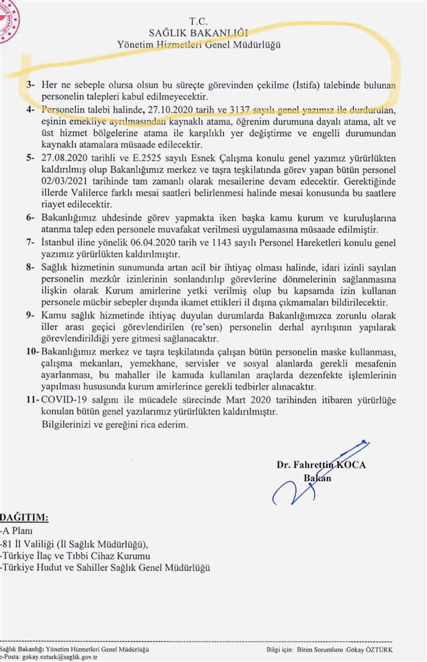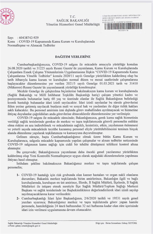 Sağlık Bakanlığı'nın genelgesinde, Mart 2020'den itibaren yürürlüğe konulan bütün genel yazılar yürürlükten kaldırıldı, normal düzen ve mesai saatlerinde çalışmalara başlanacağı belirtildi.