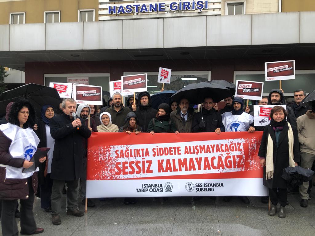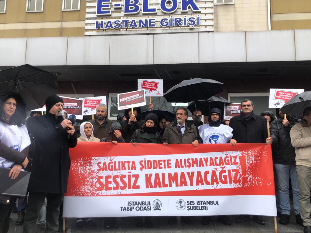 İstanbul Tabip Odası ve Sağlık(İTO) ve Sosyal Hizmetleri Emekçileri Sendikası İstanbul Şubesi(SES) doktor Burak Altunpak’a uygulanan şiddete ilişkin Bakırköy’de bulunan Dr. Sadi Konuk Eğitim Araştırma Hastanesinin acil girişinde ortak basın açıklaması yaptı. Eylem yapan sağlık çalışanları, “Sağlıkta şiddete alışmayacağız, sessiz kalmayacağız” parkatı açarak “Sağlıkta şiddete son” sloganı attı.