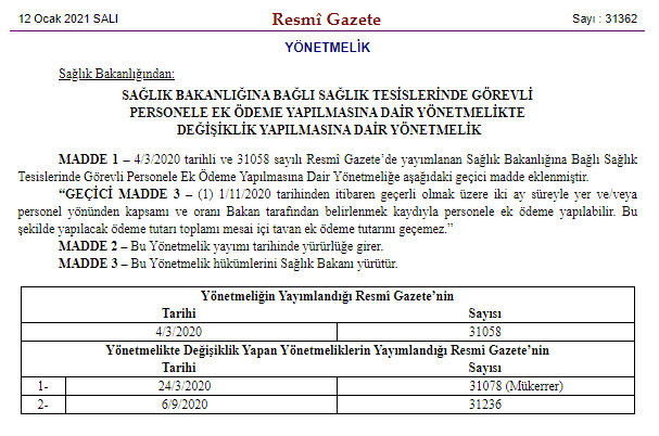 Sağlık personeline ek ödeme yapılabilmesine yönelik bir önceki karar, Ağustos Eylül Ekim 2020 ayları için alınmış ve yürürlüğe girmişti.