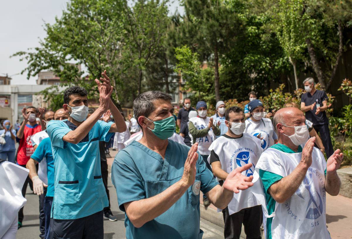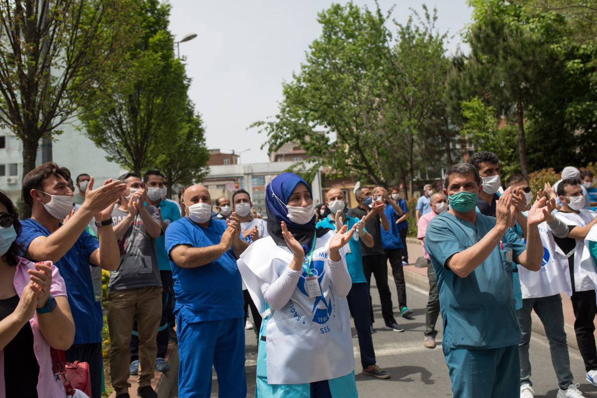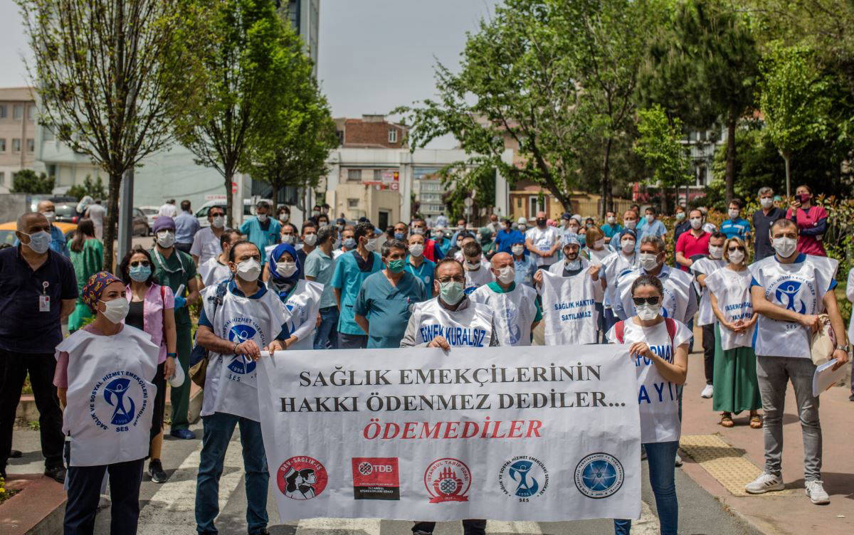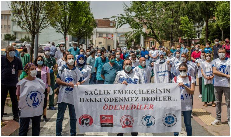 Sağlık emekçileri üzerlerine “İş, ücret, işyeri güvencesi”, “Performansa hayır” ve “Ücretsiz, nitelikli, ulaşılabilir, anadilde eğitim” yazılı önlükler giyerek, “Adaletsizliğe son verin”, “Sağlık çalışanlarının arasında ayrım yapılmamalı” sloganları attı. Burada konuşan Dev Sağlık-İş Sendikası Genel Sekreteri Erdoğan Demir, Sağlık Bakanlığı’nın salgının başlamasıyla birlikte sağlık çalışanlarına bir söz verdiğini ancak bunun yerine getirilmediğini söyleyerek, sağlık emekçilerinin hakkının bir an önce ödenmesini istedi. Demir, Sağlık Bakanı’na adaletsizliğe son vermesi için çağrıda bulunarak, “Taşerondan kadroya geçirilen arkadaşlarımız ek ödemelerin dışında tutuldu. Ek ödeme alan hemşire ve doktorlar arasında da ciddi anlamda adaletsizlik söz konusudur. 20 kata varan farklı ödemeler mevcut. Hastanenin içinde çalışan herkes, sağlık emekçisidir. Taşeron işçilere ve güvenlik görevlilerine ek ödeme vermiyorsunuz. Şunu bilin bu hastanede bir güvenlik görevlisi koronavirüsten yaşamını yitirdi” diye konuştu.