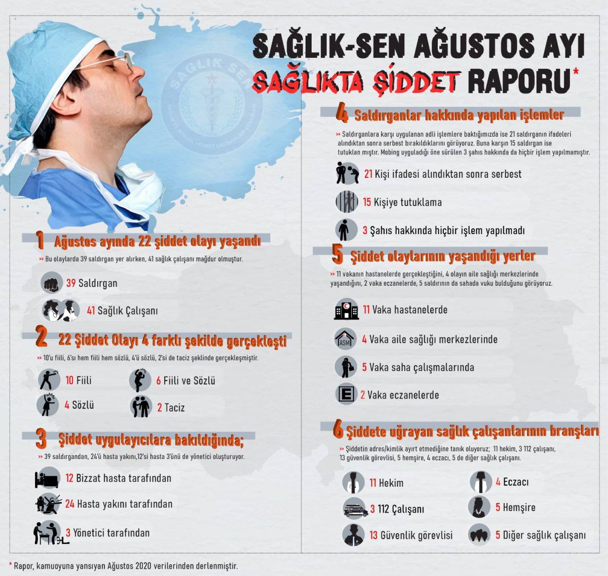 Sağlık-Sen Ağustos Ayı Sağlıkta Şiddet Raporu’nu yayımladı. Rapora göre Ağustos ayı boyunca, sağlık birimlerinde 22 şiddet olayının yaşandı, bu olaylarda 39 saldırgan yer alırken, 41 sağlık çalışanı şiddet mağduru oldu.22 olayın 10’u fiili, 6’sı hem sözlü hem fiili, 4’ü sözlü, 2’si ise taciz şeklinde gerçekleşti. Olaylarda hasta yakınlarının ön planda yer aldı. 39 saldırgandan 24’ü hasta yakını iken, 12’si hasta, 3’ünü de yöneticiler oluştu.
