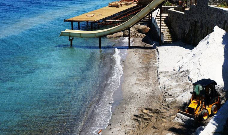 Bodrum’un Yalıkavak ve Gündoğan sahilinde denize sıfır 2 otel mermer tozunu sahile sermeye çalışırken yakalandı. Denize Maldivlerin sahillerinde bulunan beyaz kumu görüntüsünü vermek isteyen 2 otele Çevre İl Müdürlüğü ile Bodrum Belediyesi Çevre kontrol koruma müdürlüğü tarafından baskın yapıldı. Mermer tozunu sahile sererken suçüstü yakalandılar. Mermer tozu olduğu iddia edilen kum için otele para cezası uygulandı. Yalıkavak mahalleside bulunan otele Çevre ve şehircilik müdürlüğü tarafından 310 bin lira, Bodrum Belediyesi ise 35 bin lira ceza kesiti. Bodrum’un sahillerini mermer tozu ile Maldivlere çevirmeye çalışan diğer otel için ise soruşturma başladıkları öğrenildi.