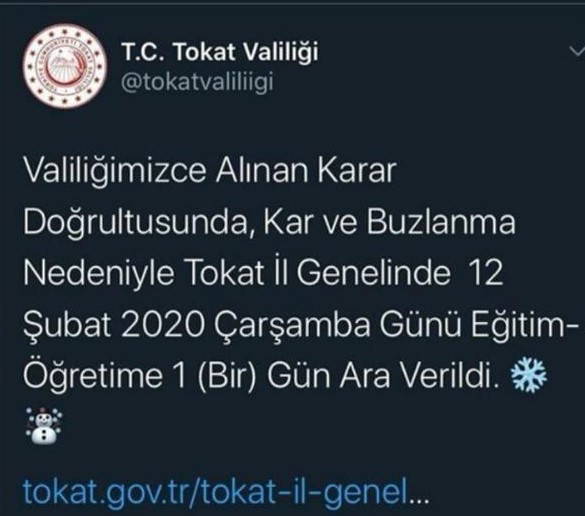 Öte yandan, Tokat İl Milli Eğitim Müdürlüğünden yapılan açıklamada ise Tokat’ta 12 Şubat 2020 Çarşamba günü için gerçekten eğitime ara verilen yerler ise Turhal, Yeşilyurt ve Artova ilçelerindeki taşımalı eğitim kapsamındaki okullar ve Zile ilçe genelindeki tüm okullar olduğu bilgisi paylaşıldı. Yağışın devam ettiği kent genelinde eğitime ara verilen bölgelerin tamamının 23.00’da açıklanacağı bildirildi.