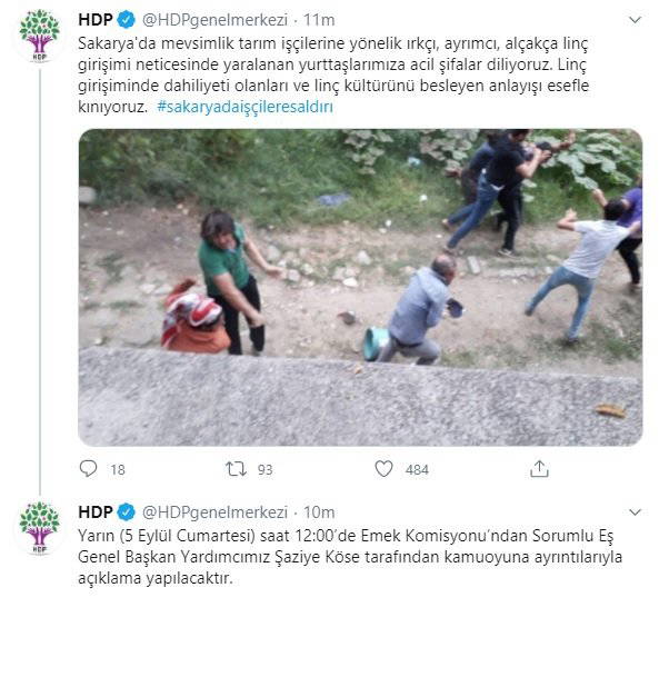 HDP Sakarya’da yaşanan olayla ilgili bir açıklama yaptı. “Sakarya’da mevsimlik tarım işçilerine yönelik ırkçı, ayrımcı, alçakça linç girişimi neticesinde yaralanan yurttaşlarımıza acil şifalar diliyoruz. Linç girişiminde dahiliyeti olanları ve linç kültürünü besleyen anlayışı esefle kınıyoruz” denilen açıklamada HDP’nin konuyla ilgili Cumartesi günü bir basın toplantısı düzenleyerek bilgilendirme yapacağı belirtildi.