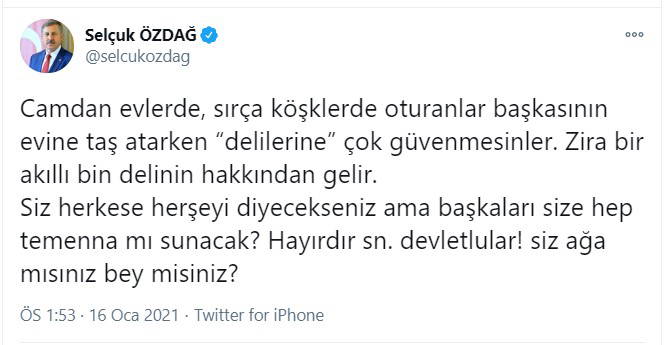 “Camdan evlerde, sırça köşklerde oturanlar başkasının evine taş atarken “delilerine” çok güvenmesinler. Zira bir akıllı bin delinin hakkından gelir. Siz herkese herşeyi diyecekseniz ama başkaları size hep temenna mı sunacak? Hayırdır sn. devletlular! siz ağa mısınız bey misiniz?”