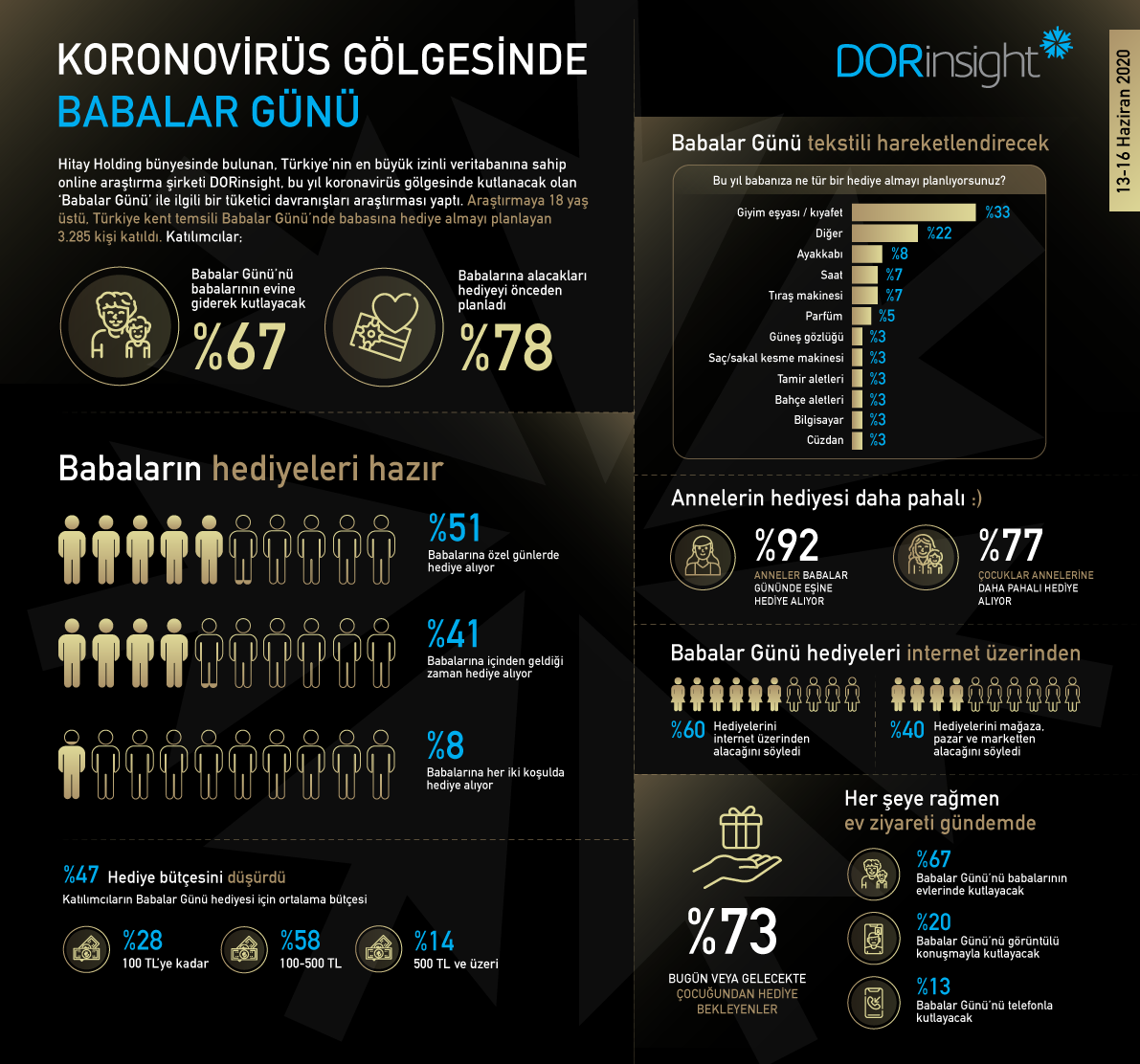 DORinsight tarafından yapılan araştırma, koronavirüs salgınının Cne etkilerini ortaya koydu. Katılımcıların yüzde 67’si Babalar Günü’nü babalarının evine giderek kutlayacağını belirtirken, yüzde 78’lik kesim alacakları hediyeyi önceden planladığını söyledi.