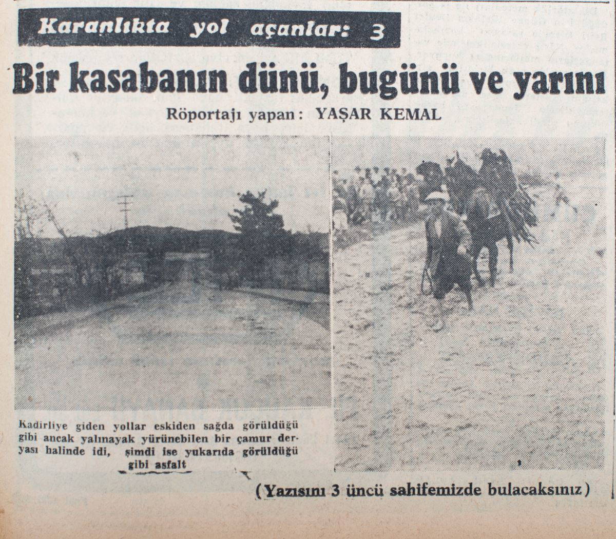 Yavaş yavaş Kadirlinin etrafındaki bataklıklar kurudu. Bu küçük bataklıkların kurumasında çeltiğin büyük faydası oldu. O çeltik ki, Çukurun başına belâ, o çeltik ki, şimdi sıtma ve ölüm kaynağı.. Sonra da Akçasaz bataklığı kurutuldu. Hava azıcık değişti. Sıtma da o kadar olmaz oldu.. Ama gene de var. 1950’den önce kasabadaki insan sayısı 3000 idi.. Şimdi 7000’den fazlaymış. Kasabaya akan köylüler, burasını taşırmışlar. Bu kuruluş halindeki kasabaya Ala Camiden sonra bir başka cami de yapılmış. Bir de çarşısı vardı. Bu çarşıyı irice çakıl taşlarından döşemişlerdi. Ben o çarşıyı severdim. Kocaman da dut ağaçları vardı. Başkaca bu kasabanın hiçbir yerine dokunulmamıştı. Cevdet Paşa nasıl yapmış, kurmuşsa öyleydi. Önce kasabaya Saffet Bey adında bir Belediye Başkanı geldi. Kasabada o zamana kadar birkaç dut ağacından başka hiç ağaç yoktu. Çarşının yanına küçücük, el içi kadar bir park yaptırdı. Şimdi o parkı kahve olarak kullanıyorlar.
