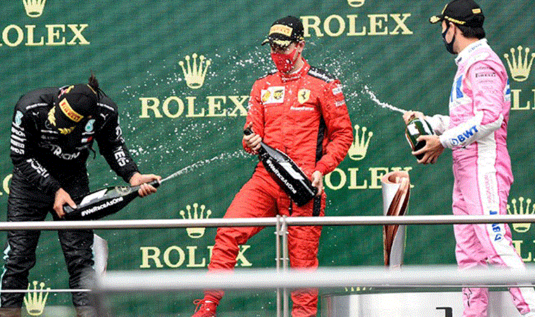 Formula 1'in ‘şampanyalı' geleneksel podyum kutlaması, Türkiye'de sönük kaldı. Bunun nedeni, pilotlara kutlama için şampanya yerine gazoz verilmesi! Mercedes takımının patronu Toto Wolff bu konuda “Eve (Hamilton'la) birlikte uçuyoruz ve bardaklarda podyumda gördüğünüz gibi gazoz olmayacak” dedi.