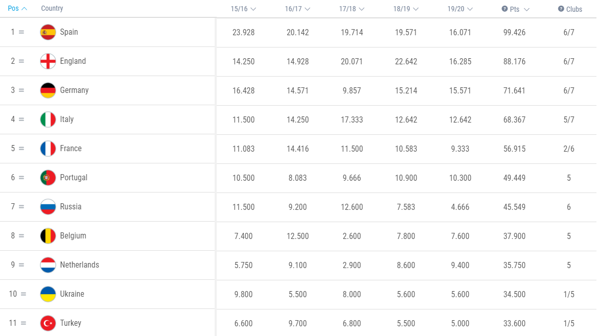 Süper Lig kulüpleri için kritik bir detay ise 2020/21 sezonunda Avrupa’da gösterecekleri performans olacak. Ülke puanı açısından 11. sırada olan Türkiye, 12. sıradaki Avusturya’dan sadece 0.675 puan yukarıda bulunuyor.