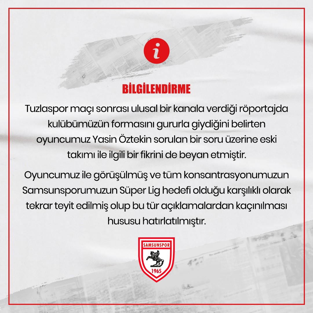 Tuzlaspor maçı sonrası ulusal bir kanalda verdiği röportajda kulübümüzün formasını gururla giydiğini belirten oyuncumuz Yasin Öztekin sorulan bir soru üzerine eski takımı ile ilgili bir fikrini de beyan etmiştir. Oyuncumuz ile görüşülmüş ve tüm konsantrasyonumuzun Samsunsporumuzun Süper Lig hedefi olduğu karşılıklı olarak tekrar teyit edilmiş olup, bu tür açıklamalardan kaçınılması hususu hatırlatılmıştır.”