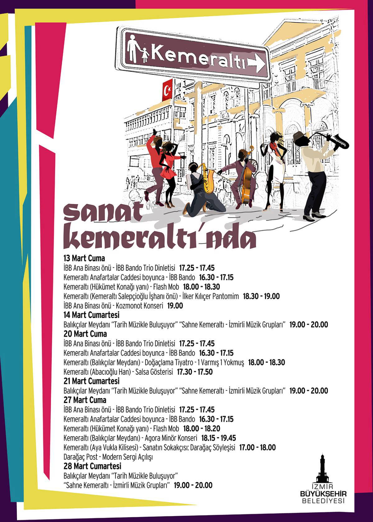 Canlı heykel performansları, gece şovları, pantomim, müzik, dans, flash mob, söyleşiler, sergiler, anlatılar ve tiyatro oyunlarından oluşan etkinlikler dizisi 13 Mart Cuma günü başlayacak. Basmane’de 18.00 ile 18.30 arasında sokak tiyatrosu, Şirinyer İZBAN çıkışında Lindy Hop dans gösterisi yapılacak. Kemeraltı Anafartalar Caddesi’nde ise aynı saatlerde İzmir Büyükşehir Belediye Bandosu çalacak.