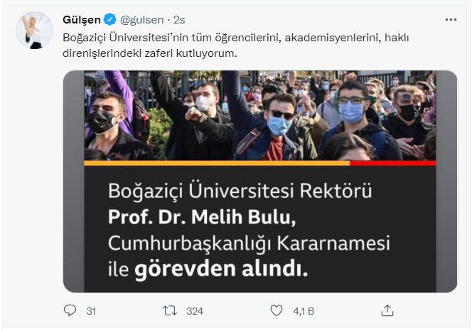 Geçtiğimiz günlerde giydiği kıyafet nedeniyle cinsiyetçi saldırılara uğrayan sanatçı Gülşen, sosyal medya hesabından yaptığı paylaşımda, "Boğaziçi Üniversitesi’nin tüm öğrencilerini, akademisyenlerini, haklı direnişlerindeki zaferi kutluyorum" diyerek Boğaziçi Üniversitesi öğrencilerinin ve akademisyenlerinin yanında olduğunu belirtti.