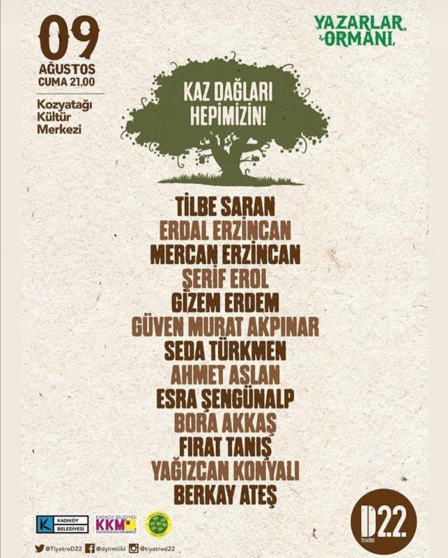 "Sizlere bir çağrımız var” diyen Ateş, “Şiirlerimizi, şarkılarımızı sizlerle paylaşmak istiyoruz. Kaz Dağları için, doğamız için, ülkemiz için gelin, cuma(bugün) akşamı hep birlikte bir fidan olalım” dedi. Halk müziği sanatçıları Erdal Erzincan ve Mercan Erzincan’da “Türkülerle, şiirlerle sizlerle olacağız. Kaz Dağları’ndaki katliama dur demek istiyoruz, sizleride bekliyoruz” diyerek etkinliğe katılım çağrısında bulundu.