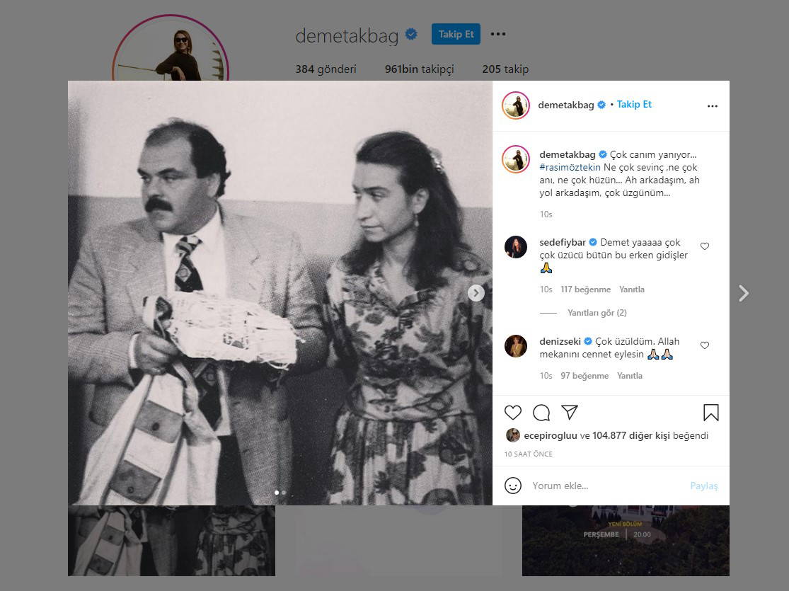Demet Akbağ: Çok canım yanıyor… Rasim Öztekin Ne çok sevinç, ne çok anı, ne çok hüzün… Ah arkadaşım, ah yol arkadaşım, çok üzgünüm…