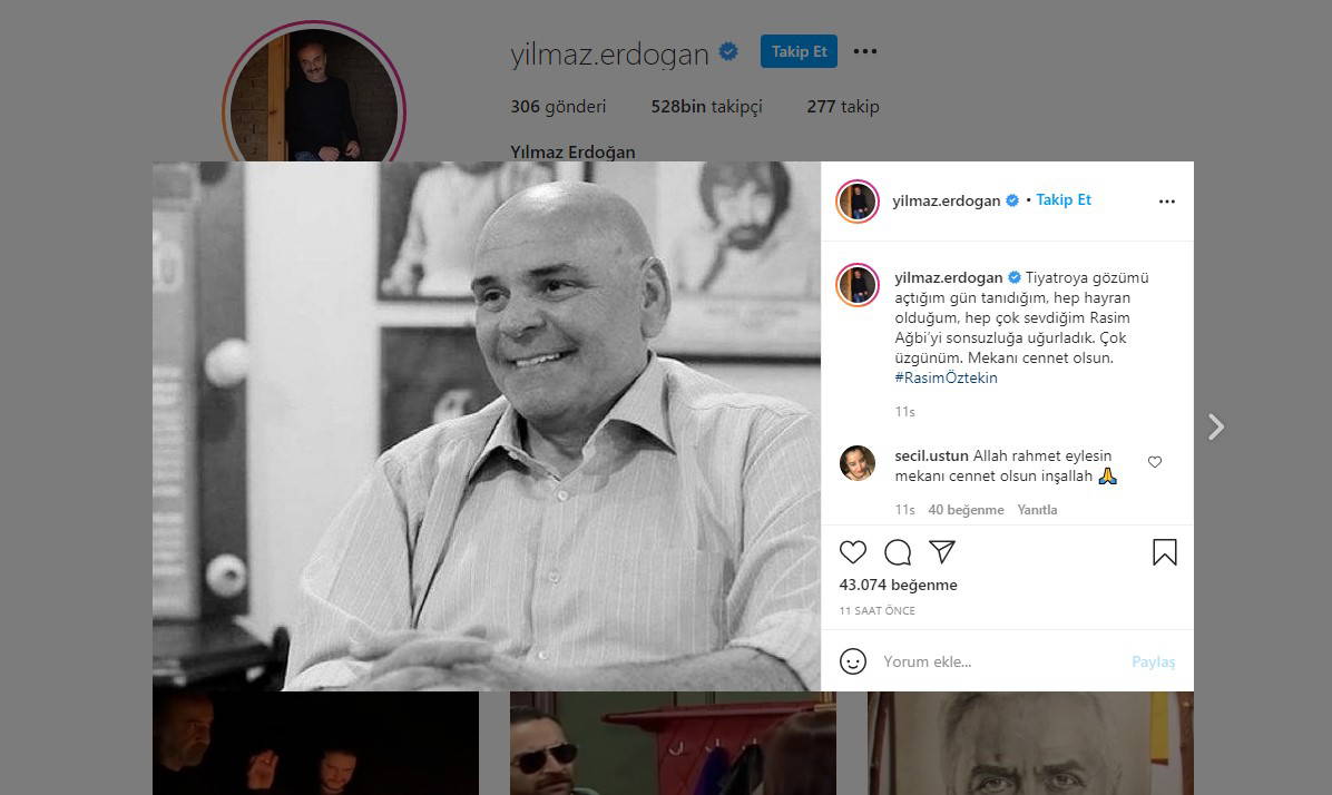 Yılmaz Erdoğan: Tiyatroya gözümü açtığım gün tanıdığım, hep hayran olduğum, hep çok sevdiğim Rasim Ağbi'yi sonsuzluğa uğurladık. Çok üzgünüm. Mekanı cennet olsun.