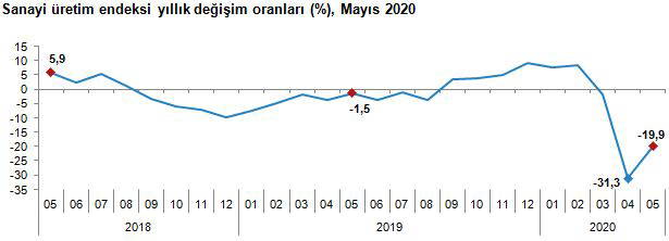TÜİK verilerine göre, sanayinin alt incelendiğinde, 2020 yılı Mayıs ayında madencilik ve taşocakçılığı sektörü endeksi bir önceki yılın aynı ayına göre yüzde 14,2, imalat sanayi sektörü endeksi yüzde 20,6 ve elektrik, gaz, buhar ve iklimlendirme üretimi ve dağıtımı sektörü endeksi yüzde 13,3 azaldı.