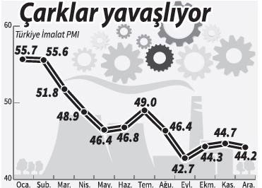 Ekonomi küçülürken, sanayide çarklar giderek yavaşlıyor. İstanbul Sanayi Odası (İSO) tarafından yayımlanan Türkiye imalat sanayi satın alma yöneticileri endeksi (PMI) aralık ayında 44.2’ye gerileyerek sektördeki daralmanın dokuzuncu aya girdiğine işaret etti. IHS Markit tarafından İSO için hazırlanan imalat PMI ekimde 44.3 değerini aldıktan sonra kasımda 44.7’ye yükselmişti.