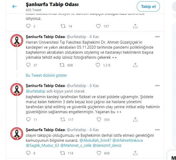 Şanlıurfa Tabip Odası, Harran Üniversitesi Tıp Fakültesi Başhekimi Ahmet Güzelçiçek’in koronavirüs tedavisi gören babasının entübe olması sonrası Başhekimin kardeşi ve akrabalarının hastaneye giderek, orada görevli asistan doktorlarla tartışıp fotoğraflarını çekerek, önce tehdit ettiklerini ardından darp ettiklerini sosyal medya hesabından duyurdu.