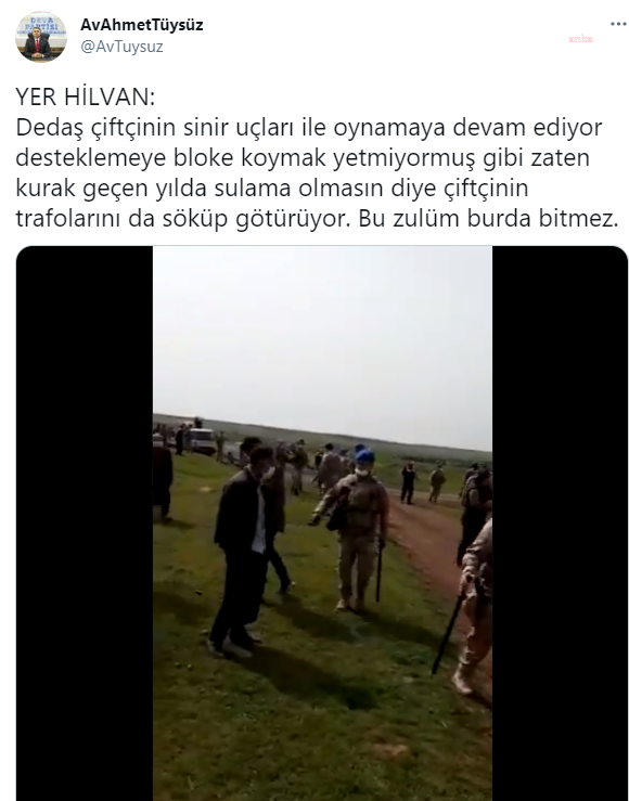 Elektrikli sondaj pompalarıyla kuyulardan çekilen suyla tarlasını sulayan Şanlıurfalı çiftçiler faturasını ödeyemeyince Dicle Elektrik Dağıtım Şirketi (DEDAŞ) jandarma ile birlikte Kuskunlu köyü çiftçilerinin trafolarını söktü. Trafoların sökülmesi esnasında köylüler ile jandarma karşı karşıya geldi. Paylaşılan görüntülerde sökülmüş trafolar kamyonetle götürülürken, köylüler ile jandarma arasında tartışma yaşanıyor. Video çekimi yapan köylüler tarımsal desteklemelerine DEDAŞ borcu nedeniyle bankada bloke konulduğunu belirterek, “Desteklememize el konuluyor, nerede milletvekilleri?” diyerek tepki gösterdi.