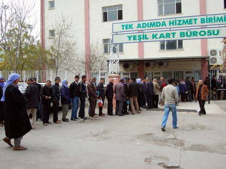 Yılın son aylarında talep edilen 30 bin yeni karnenin de geldiği Topçu Meydanı'ndaki yeşil bürosu önünde sabah saatlerinden itibaren yoğunluk oluştu.