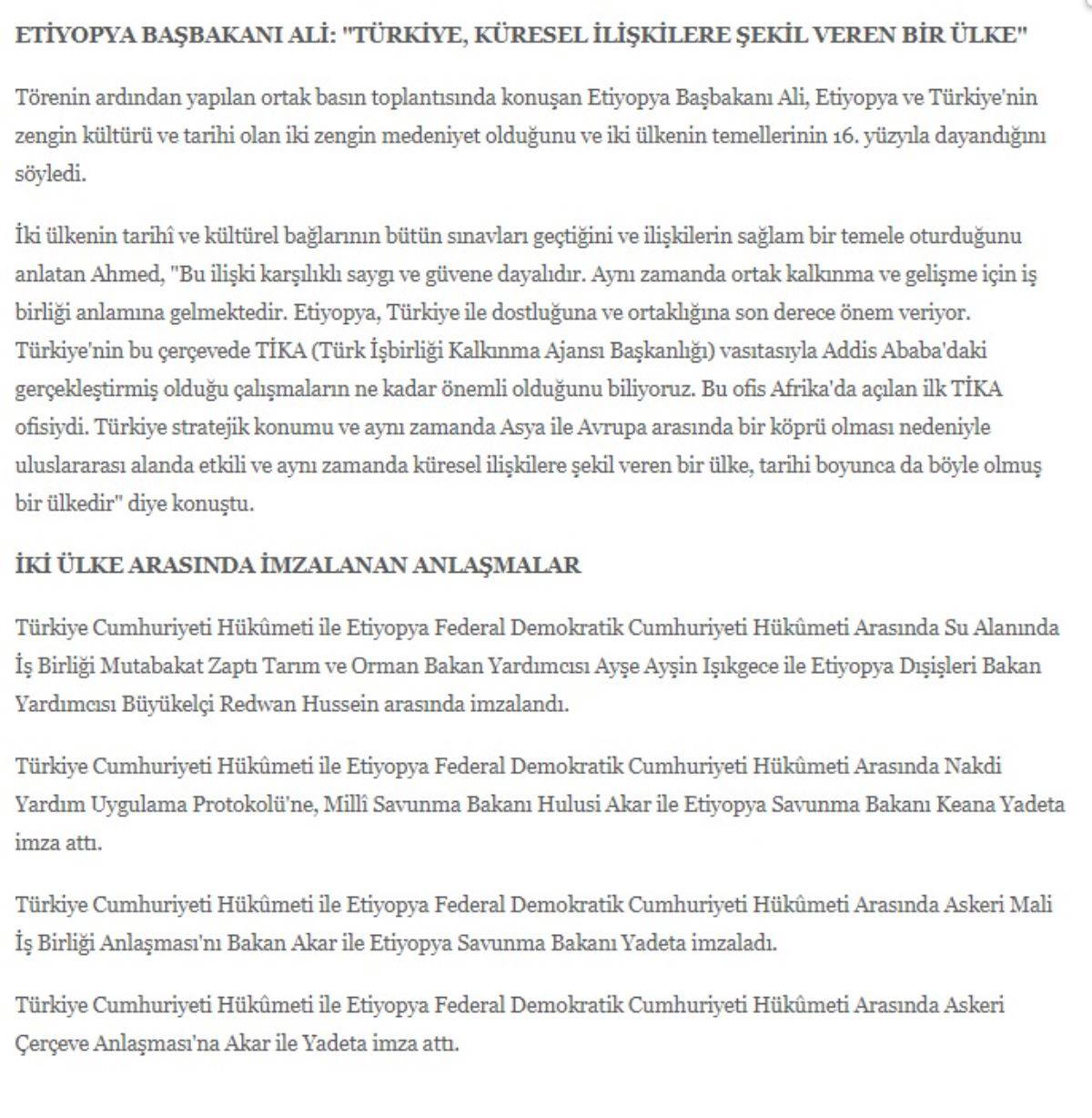 Özkan'ın paylaştığı ve Cumhurbaşkanlığı internet sitesinde yer alan bölümde; Etiyopya Başbakanı Abiy Ahmed'in Mustafa Kemal Atatürk ile ilgili sözlerine yer verilmediği görülüyor.