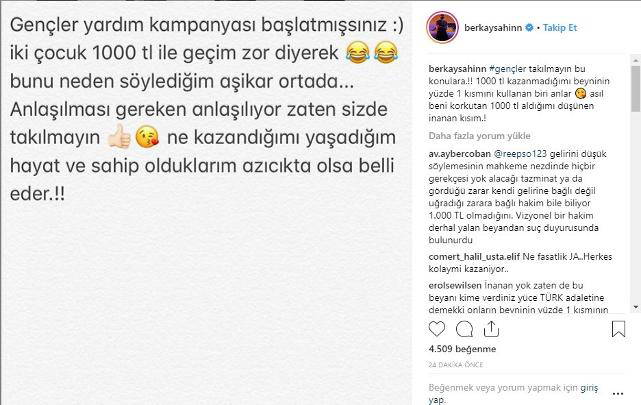 Berkay Şahin duruşma çıkışında direksiyon başında bir viedo çekerek şunları söyledi: Berkay: Arkadaşlar 1000 TL gelire takılmışsınız ama onu benim neden söylediğim ortada. 1000 TL kazanmadığımın herkes farkındadır. Öpüyorum, bunlara takılmayın, geçin gidin.