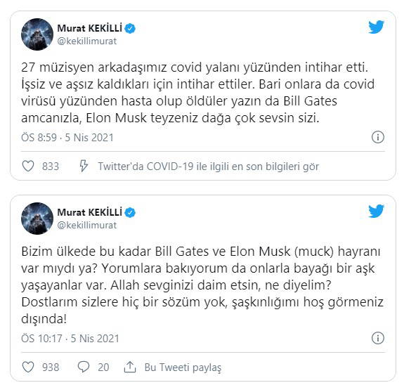 "27 müzisyen arkadaşımız Covid yalanı yüzünden intihar etti. İşsiz ve aşsız kaldıkları için intihar ettiler. Bari onlara da Covid virüsü yüzünden hasta olup öldüler yazın da Bill Gates amcanızla, Elon Musk teyzeniz dağa çok sevsin sizi.