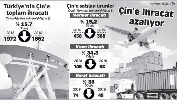 ABD ile Çin arasında tırmanan ticaret savaşı ve Çin ekonomisindeki yavaşlama Türkiye’nin ihracatını da olumsuz etkiliyor. Türkiye İhracatçılar Meclisi verilerine göre, Türkiye’nin Çin’e ihracatı 2019’un ilk 8 ayında geçen senenin aynı ayına göre yüzde 15.7 düşüşle 1 milyar 972 milyon dolardan 1 milyar 662 milyon dolara geriledi. Gerilemede, Türkiye’nin Çin’e ihracatının lokomotifleri olan mermer, krom ve borat sektörleri başı çekti. Türkiye İstatistik Kurumu’na göre, 2019’un 7 ayında Türkiye’nin Çin’e mermer ihracatı geçen yılın aynı dönemine göre yüzde 15.7’lik düşüşle 388 milyon dolara, krom ihracatı yüzde 34.3 düşüşle 98 milyon dolara, borat ihracatı yüzde 35 düşüşle 48 milyon dolara geriledi. Çin’e mermer ihracatında öne çıkan firmalardan Temmer Marble Yönetim Kurulu Başkanı Rüstem Çetinkaya, düşüşün Çin’de inşaat sektörünün yavaşlamasından kaynaklandığını söyledi. Çetinkaya, ticaret savaşı nedeniyle Pekin yönetiminin inşaata ayırdığı kaynakları azalttığını aktardı.