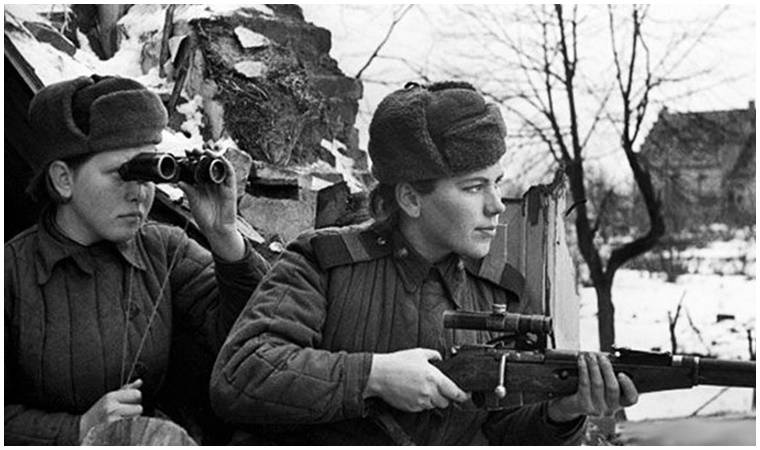 - Bella İsaakovna Epşteyn, çavuş, keskin nişancı: “İkinci Beyaz Rusya Cephesi’nde Albay ilk karşılaşmamızda bize dedi ki: ‘Bakın kızlar, mademki savaşmaya geldiniz savaşın ama başka işlerle uğraşmak yok. Etrafınız erkek dolu, kadın yok. Şeytan bilir nasıl izah edeceğiz size bazı şeyleri. Savaş bu, hatunlar, savaş…’ Daha bebe olduğumuzun farkındaydı. Bir Alman kasabasında bizi geceyi geçirmemiz için bir şatoya yerleştirdiler. Dolaplar tıka basa güzel kıyafetlerle dolu. Kızlar kendilerine birer elbise seçti. Ben de sarı bir tane beğendim, bir de sabahlık ama o kadar güzel bir sabahlık ki anlatamam, uzun, hafif… Tüy gibi! Yatma vakti geldi, hepimiz felaket yorgunuz. Giydik o elbiseleri, yattık. Hoşumuza gidenleri giyip hemen uyuduk. Ben elbisenin üzerine bir de sabahlığı geçirmiştim… Başka bir seferinde terk edilmiş bir şapka atölyesinde kendimize şapkalar seçtik; az da olsa takabilmek için bütün gece oturarak uyuduk. Sabah kalktık… Son bir kez aynaya baktık… Ve çıkardık, tekrar asker gömleklerimizi, pantolonlarımızı giydik. Yanımıza hiçbir şey almazdık. Yolda bir iğne bile ağırlık yapar. Kaşığını koncunun içine geçirir gidersin, o kadar…”