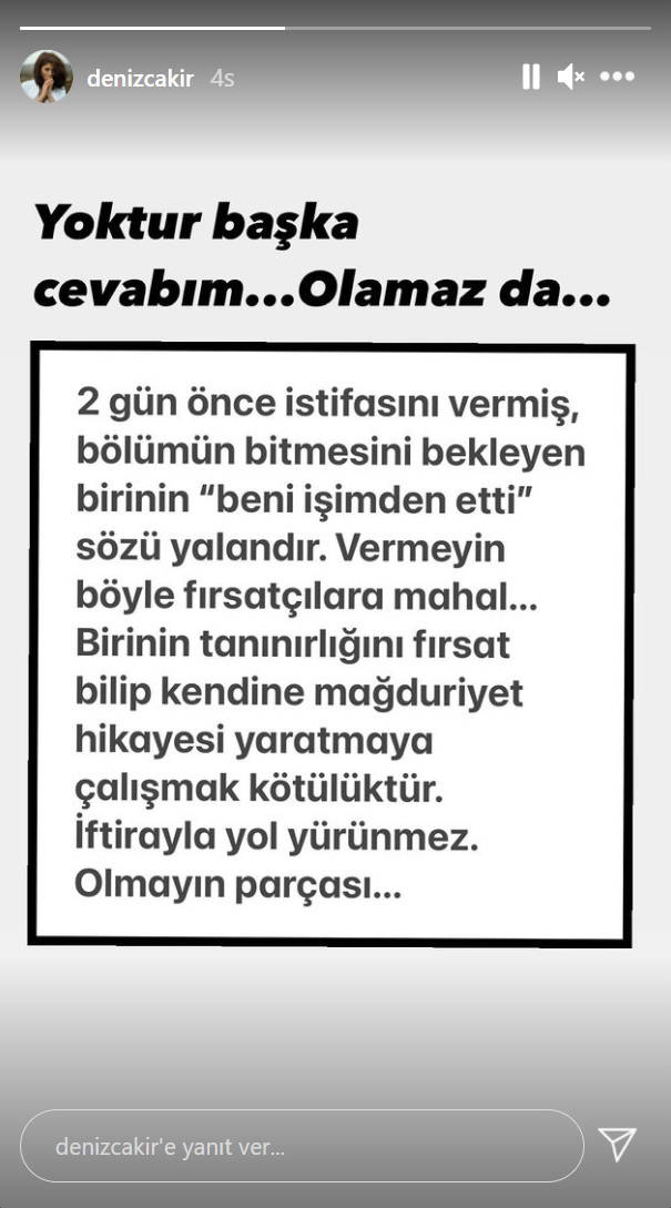 Yaşanan olayların ardından Deniz Çakır, Instagram hesabından "Yoktur başka cevabım… Olamaz da…" başlığıyla şu açıklamayı yaptı: