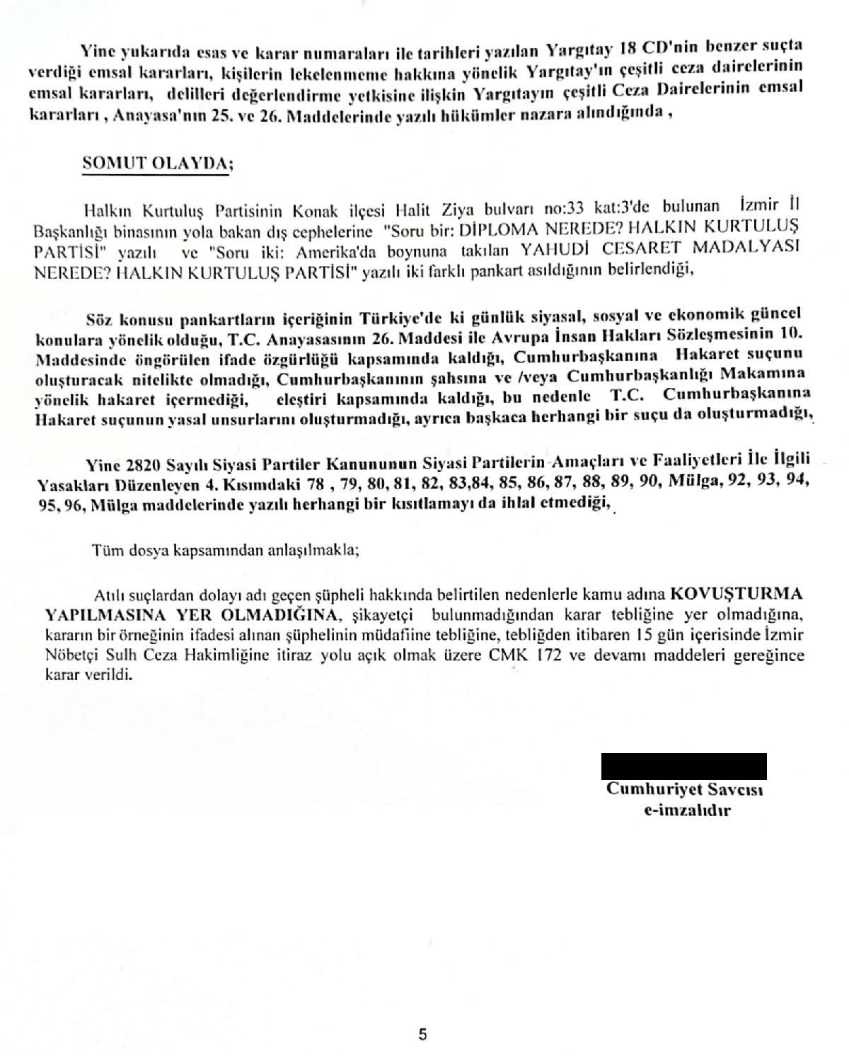 “Söz konusu pankartların içeriğinin Türkiye'de ki günlük siyasal, sosyal ve ekonomik güncel konular yönelik olduğu, T.C. Anayasasının 26. Maddesi ile Avrupa İnsanları Sözleşmesinin 10. Maddesinde öngörülen ifade özgürlüğü kapsamında kaldığı, Cumhurbaşkanına Hakaret suçunu oluşturacak nitelikte olmadığı, Cumhurbaşkanının şahsına ve/veya Cumhurbaşkanlığı Makamına yönelik hakaret içermediği, eleştiri kapsamında kaldığı, bu nedenle T.C. Cumhurbaşkanına Hakaret suçunun yasal unsurlarını oluşturmadığı, ayrıca başkaca herhangi bir suçu da oluşturmadığı,