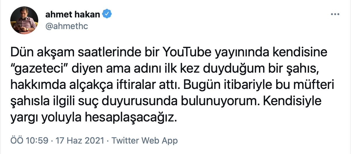 Hakan ardından, sosyal medya hesabı üzerinden "Dün akşam saatlerinde bir YouTube yayınında kendisine “gazeteci” diyen ama adını ilk kez duyduğum bir şahıs, hakkımda alçakça iftiralar attı. Bugün itibariyle bu müfteri şahısla ilgili suç duyurusunda bulunuyorum. Kendisiyle yargı yoluyla hesaplaşacağız" ifadelerini kullanmıştı.