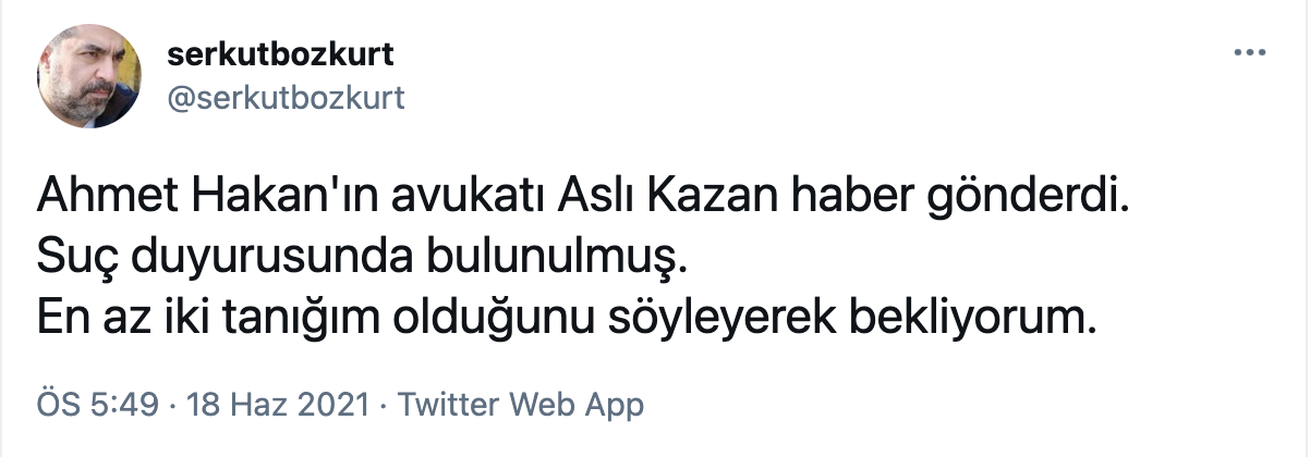 Bozkurt, Twitter hesabından, Hakan'ın kendisi hakkında suç duyurusunda bulunduğunu duyurdu. Bozkurt, "Ahmet Hakan'ın avukatı Aslı Kazan haber gönderdi. Suç duyurusunda bulunulmuş. En az iki tanığım olduğunu söyleyerek bekliyorum" ifadelerini kullandı.