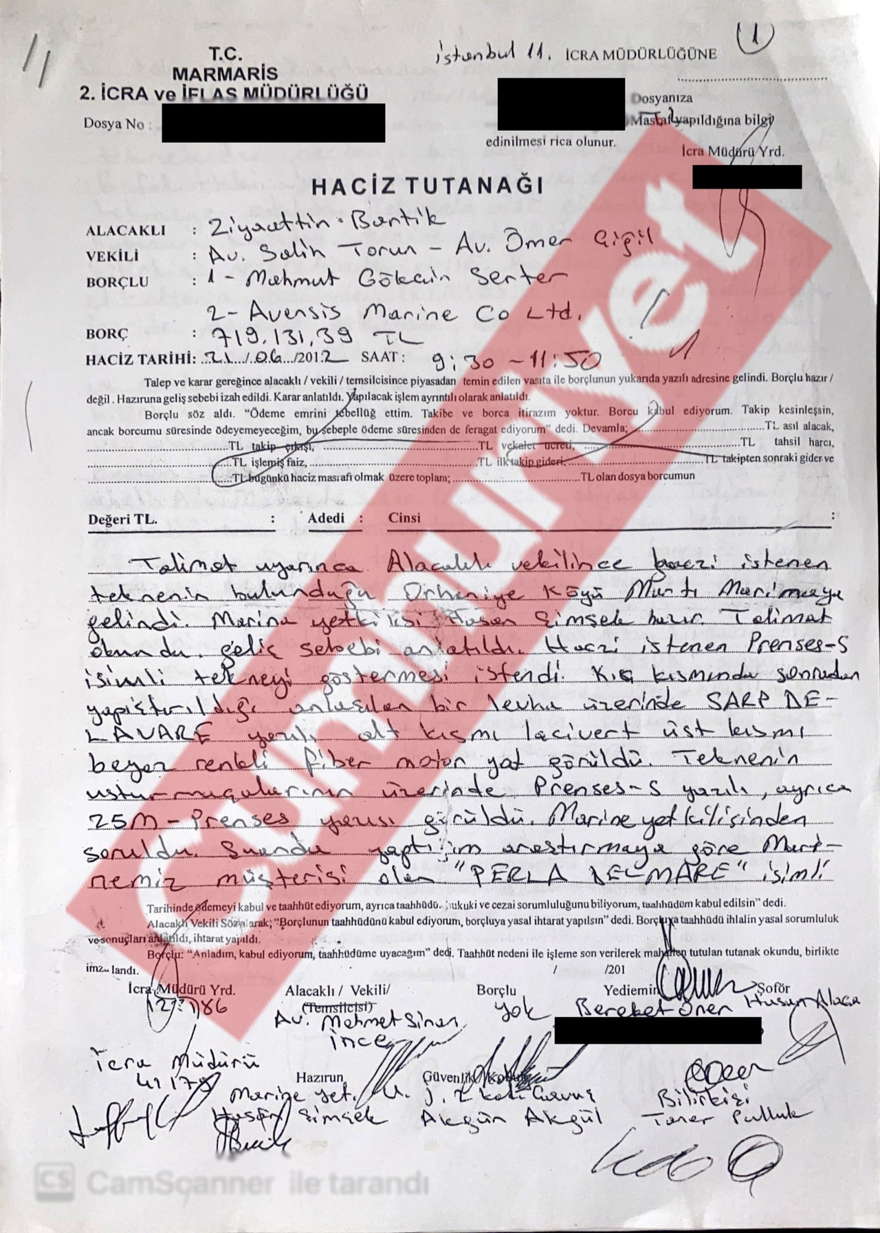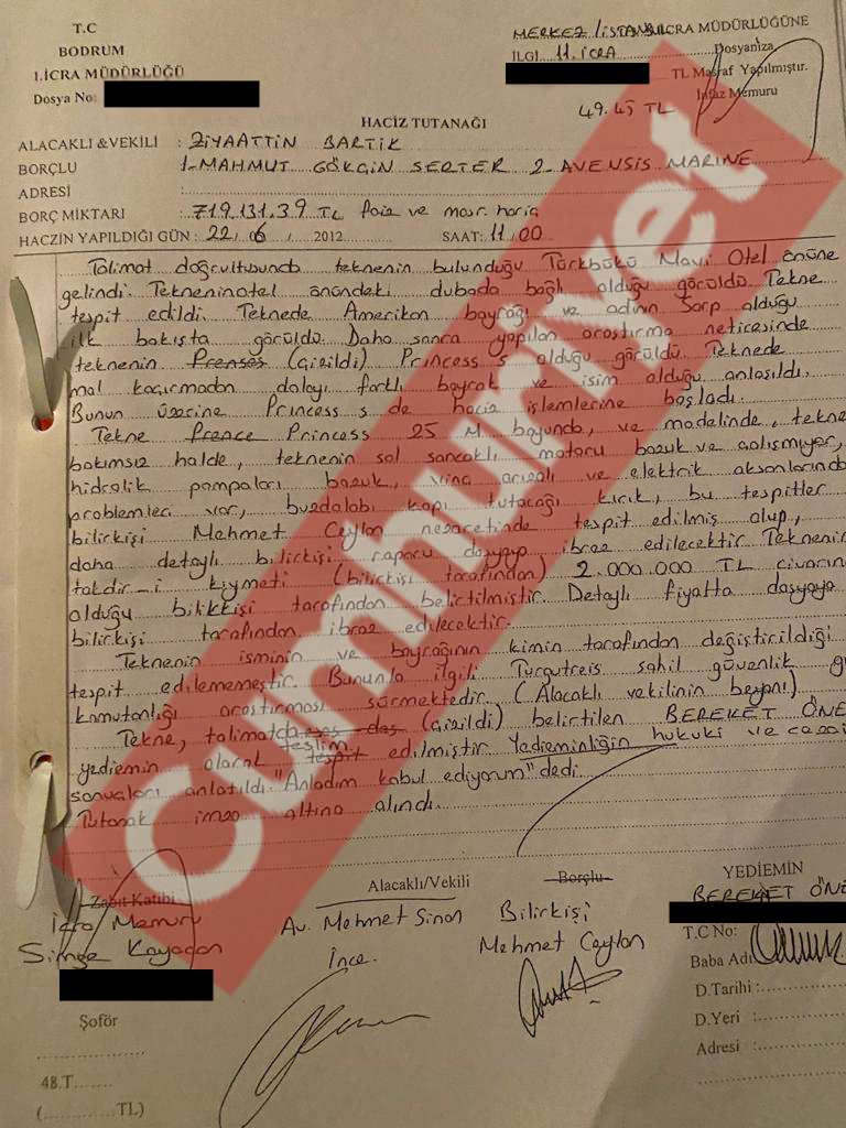 Tekneye Bereket Öner, avukat Mehmet Sinan İnce, bilirkişi ve jandarmalar geldi. Haczi istenen malın bu tekne olduğu tarafların beyanıyla tespit edildi. Avukat İnce’ye göre, “Taner Pulluk” imzalı “bilirkişi” sıfatıyla tekneyi inceleyen isim ise SBK idi. Ve tekne Bereket Öner’e yani SBK’nin çalışanına teslim edildi. Bereket Öner, yasal mevzuatlar bitene kadar “Tekneyi burada tutacağım” diyerek haciz tutanağını imzaladı.
