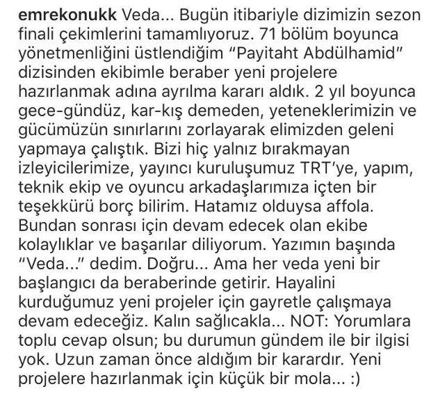 Gündemdeki siyasi tartışmalara göndermeleriyle bilinen ve en son Abdullah Gül ve Ahmet Davutoğlu'na mesaj gönderdiği tartışılan TRT 1’de yayınlanan Payitaht Abdülhamit dizisinin yönetmeni ve ekibi ayrılıyor.
