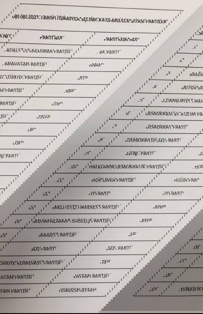 Yüksek Seçim Kurulu (YSK), 26 Ocak 2021 tarihinde yaptığı duyuruda, 17 partinin seçime girme yeterliliğine sahip olduğunu açıklamıştı. Gelecek Partisi ve DEVA Partisi listede yer almamıştı.
