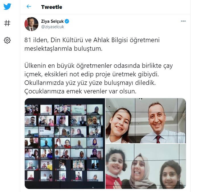 Paylaşımında toplantıdan fotoğraflara da yer veren Bakan Selçuk, "81 ilden, Din Kültürü ve Ahlak Bilgisi öğretmeni meslektaşlarımla buluştum. Ülkenin en büyük öğretmenler odasında birlikte çay içmek, eksikleri not edip proje üretmek gibiydi. Okullarımızda yüz yüze buluşmayı diledik. Çocuklarımıza emek verenler var olsun" ifadelerini kullandı.