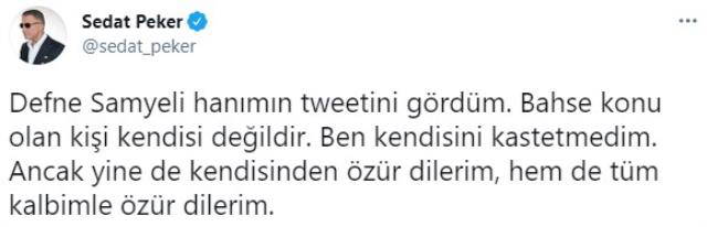 Samyeli'nin açıklamasını gören Peker ise sosyal medya hesabından özür dileyerek, "Defne Samyeli hanımın tweetini gördüm. Bahse konu olan kişi kendisi değildir. Ben kendisini kastetmedim. Ancak yine de kendisinden özür dilerim, hem de tüm kalbimle özür dilerim" dedi.