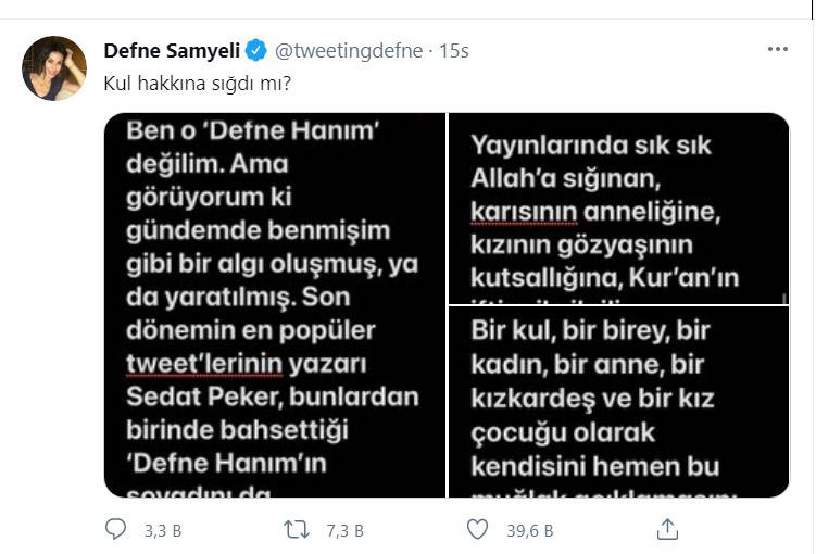 Kendisinin bahsi geçen Defne olmadığını söyleyen Samyeli, "Ben o Defne Hanım değilim. Ama görüyorum ki gündemde benmişim gibi bir algı oluşmuş, ya da yaratılmış. Son dönemin en popüler tweetlerinin yazarı Sedat Peker, bunlardan birinde bahsettiği Defne Hanım'ın soyadını da bahşederse, başta ben olmak üzere diğer kadın, anne, kız çocuğu Defne'ler durduk yere zan altında kalmaz iftiraya uğramaz. Yayınlarında sık sık Allah'a sığınan, karısının anneliğine, kızının gözyaşının kutsallığına, Kur'an'ın iftira ile ilgili hükümlerine ve de 'kul hakkı'na atıfta bulunan Sedat Peker, bu konularla ilgili sadece kendi ve ailesinin Allah katında imtiyazlı olduğunu düşünmüyordur sanırım" ifadelerine yer verdi.