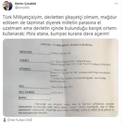 Sosyal medya hesabı üzerinden yaptığı açıklamada, "Türk Milliyetçisiyim, devletten şikayetçi olmam, mağdur edilsem de tazminat diyerek milletin parasına el uzatmam ama devletin içinde bulunduğu karışık ortamı kullanarak; iftira atana, kumpas kurana dava açarım!" diye yazan Çoraklık, Sedat Peker'e yakınlığıyla bilinen Emre Olur hakkında dava açtığına dair suç duyurusu dilekçesini paylaştı.