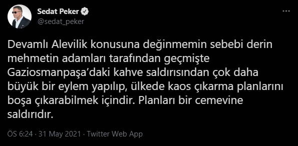 Paylaşımında Alevilik konusuna neden sıklıkla değindiğine açıklık getiren Peker, yeni bir iddiada daha bulundu.