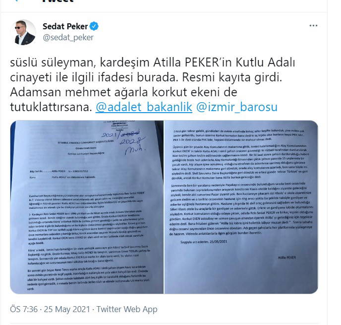 Organize suç örgütü lideri Sedat Peker, kardeşi Atilla Peker'in Kutlu Adalı cinayeti ile ilgili verdiği imzasız ifade tutanağını sosyal medya hesabından, "Süslü Süleyman, kardeşim Atilla Peker’in Kutlu Adalı cinayeti ile ilgili ifadesi burada. Resmi kayıta girdi. Adamsan Mehmet Ağar'la korkut ekeni de tutuklattırsana'' diyerek paylaştı.