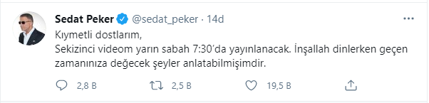 "Sekizinci videom yarın sabah 7:30’da yayınlanacak" diyen Peker, "İnşallah dinlerken geçen zamanınıza değecek şeyler anlatabilmişimdir" ifadelerini kullandı.