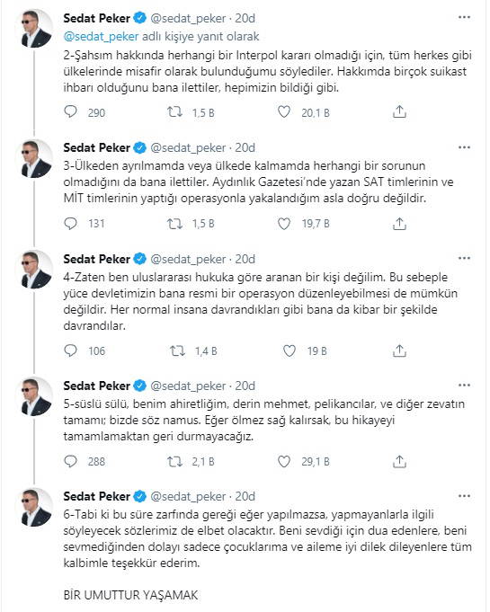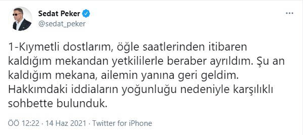 Peker, MİT operasyonu ile yakalandığı ve BAE yetkililerinin kendisini gözaltına aldığına dair iddialarla ilgili Twitter üzerinden bir açıklama yaptı. Peker, kaldığı mekana ailesinin yanına geldiğini duyurarak; iddiaları yalanladı. Peker "Eğer ölmez sağ kalırsak, bu hikayeyi tamamlamaktan geri durmayacağız." dedi.