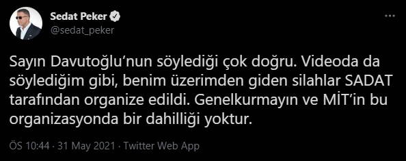 Organize suç örgütü kurmak suçlamasıyla aranan ve yurt dışında bulunan Sedat Peker, Gelecek Partisi Genel Başkanı Ahmet Davutoğlu'nun Habertürk'te yaptığı Suriye'ye giden silahlar açıklamasına, sosyal medya hesabı Twitter'dan yanıt verdi.