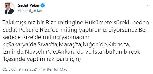Twitter hesabından 2015 yılında AKP'ye destek için yaptığı miting hakkında konuşan Peker, "Ben sadece Rize’de miting yapmadım ki" dedi.