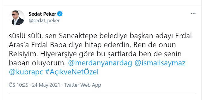 Soylu'nun açıklamalarına yanıt veren Peker, ''Süslü Süleyman, Rize’de bahsettiğin cinayet davasıyla ilgili bana avukat ayarlayan Doğru Yol İl Başkanı Nihat Mete'yle senin baban kör hasandı. O zaman senin baban ayarladı bu işleri. Süslü sülü, sen Sancaktepe belediye başkan adayı Erdal Aras’a Erdal Baba diye hitap ederdin. Ben de onun Reisiyim. Hiyerarşiye göre bu şartlarda ben de senin baban oluyorum'' dedi.