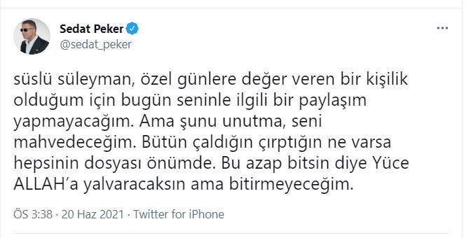 İçişleri Bakanı Süleyman Soylu'ya yönelik paylaşım yapan Peker, ''Süslü süleyman, özel günlere değer veren bir kişilik olduğum için bugün seninle ilgili bir paylaşım yapmayacağım. Ama şunu unutma, seni mahvedeceğim. Bütün çaldığın çırptığın ne varsa hepsinin dosyası önümde. Bu azap bitsin diye Yüce Allah’a yalvaracaksın ama bitirmeyeceğim'' ifadelerini kullandı.