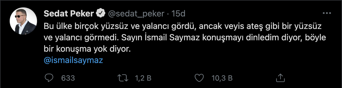 Peker'in İsmail Saymaz'ı etiketleyerek kullandığı ifadeler şu şekilde: